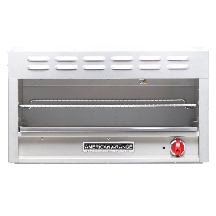 Cook with flair using top-quality equipment with the American Range ARCM-48 Gas Cheesemelter. This 48" wide cheesemelter is designed to meet the demands of commercial restaurant kitchens. With its two infra-red burners and manual controls with pilot, you have precise control over the cooking process. The stainless steel construction ensures durability and easy cleaning, while the 1 rack with 3 rack positions allows for versatile cooking options. With a power output of 12.0kW and 40000 BTU, this cheesemelter delivers consistent and efficient performance. Made in the USA and ETL certified, you can trust in the authenticity and reliability of this product. Whether you're melting cheese on top of a dish or browning the top of casseroles, the American Range ARCM-48 Gas Cheesemelter is the perfect addition to any commercial restaurant kitchen.