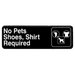 Enhance usability with Thunder Group, PLIS9319BK, Sign, Compliance. This information symbol sign is designed to optimize efficiency and compliance in commercial restaurant settings. With its self-adhesive backing, it can be easily mounted on walls or doors, ensuring clear visibility for both staff and customers. The 9" x 3" size makes it noticeable without being obtrusive, and the white lettering on a black background provides high contrast for easy reading. This sign specifically indicates that no pets or shoes are allowed, emphasizing the importance of cleanliness and safety in a restaurant environment. Trust Thunder Group, a reputable vendor in the industry, to provide you with quality products that meet compliance standards and enhance the professionalism of your restaurant.