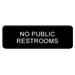 Elevate comfort with Thunder Group's PLIS9335BK Sign, Compliance. Designed specifically for commercial restaurant use, this information symbol sign is a must-have for any establishment. With its self-adhesive backing, it can be easily mounted on any surface, ensuring clear visibility for customers and staff. The 9" x 3" size is perfect for displaying important messages, such as "No Public Restrooms," in a concise and easily readable manner. The white lettering on a black background provides a high contrast that catches the eye, making sure the message is noticed. Trust Thunder Group, a reputable vendor in the industry, to provide you with a quality product that meets compliance standards. Enhance your restaurant's professionalism and ensure a comfortable environment with Thunder Group's PLIS9335BK Sign, Compliance.
