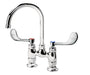 Introducing the Krowne Metal, 15-401L-W-E4 Gooseneck Faucet, designed to simplify restaurant operations. This Royal Series faucet features a 4" raised deck mount with a 6" wide gooseneck spout and VR wristblade handles, providing both style and functionality. With a 1.5 GPM aerator, this faucet ensures efficient water flow while conserving water, making it ideal for a commercial restaurant setting. Its gooseneck design allows for easy filling of large pots and pans, making it perfect for busy kitchens. Whether you're washing dishes or filling up containers, this faucet offers convenience and durability. Upgrade your restaurant's kitchen with the Krowne Metal, 15-401L-W-E4 Gooseneck Faucet and experience enhanced efficiency and performance.