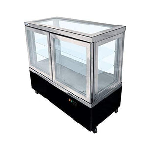 Tekna Refrigerated Display Case, freestanding, full service, 35-2/5"W x 25"D x 48-2/5"H, 9.0 cu. ft. capacity, self-contained refrigeration, glass top, straight glass front & sides, (1) hinged rear glass door, (2) glass shelves, LED lighting, temperature range +23°F - 48°F, black steel lower base, (4) casters, 1/2 HP, 110v/60/1-ph, 9.0 amps, cord with NEMA 5-15P, ETL-Sanitation, cETLus